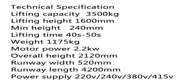 This 4 post hoist can be used for repair or parking. Hoist is supplied with integrated hydraulic rolling jack. This hoist has 3.5T capacity with 4200 long runways